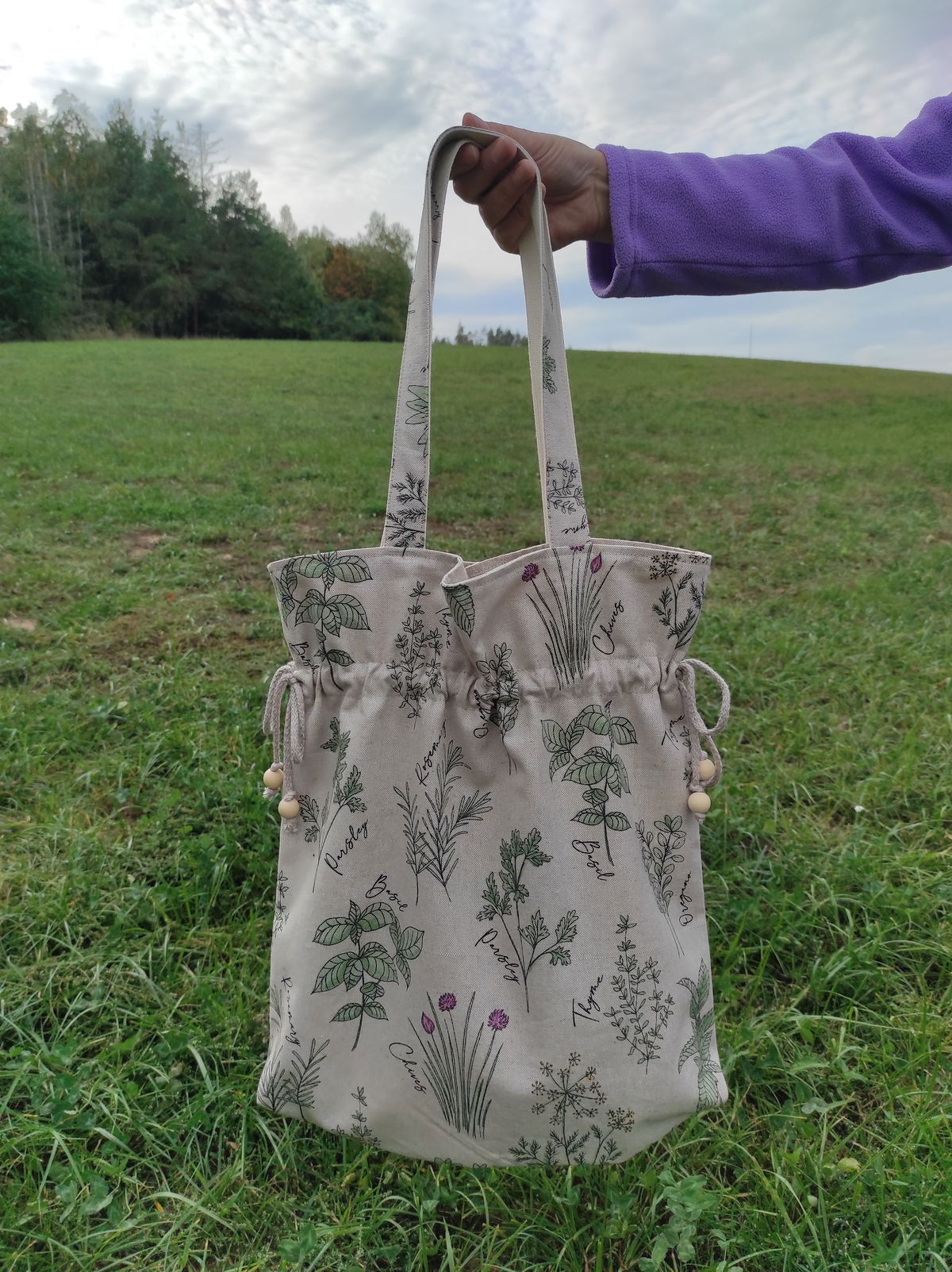 Šíři tašky si lze přizpůsobit stáhnutím šňůrky, konce šňůrek jsou ozdobeny dřevěnými korálky. Šíře tašky cca 41cm, celková výška cca 44 cm. Délka popruhu je 61 cm.Uši jsou z bavlněného popruhu, který je z jedné strany podšitý látkou. Výhoda bavlněného popruhu je, že na rameni neklouže.